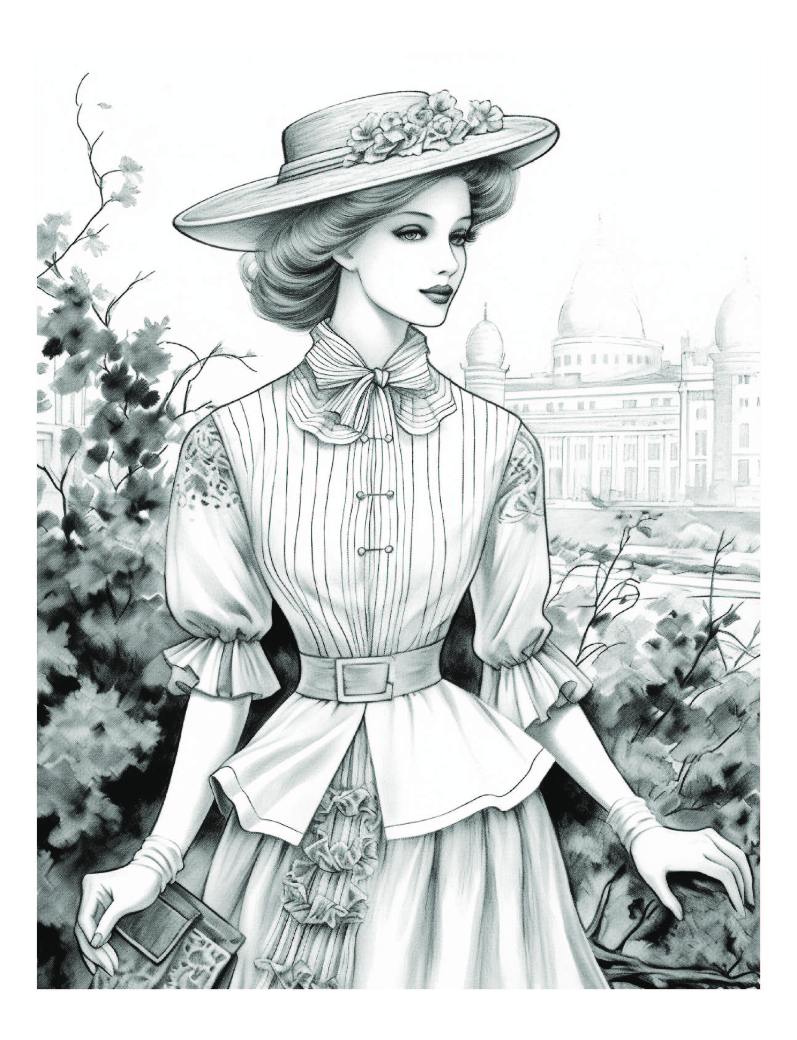Laden Sie dieses exklusive Vorschau-Bild aus dem Ausmalbuch "Zeitreise in Farbe: 80 Seiten Vintage Mode zum Ausmalen" herunter und beginnen Sie Ihre kreative Reise durch die Modegeschichte. Diese fein ausgearbeitete Illustration zeigt eine elegante Dame aus den frühen 1910er Jahren, komplett mit einem breitkrempigen Hut, verziert mit Blumen, und einem detailreichen, hochgeschlossenen Kleid, das die typische Mode dieser Ära widerspiegelt. Die stolze Haltung und der ausdrucksstarke Blick der Dame fangen den Geist einer vergangenen Zeit ein, als Mode nicht nur Kleidung, sondern eine wahre Kunstform war.