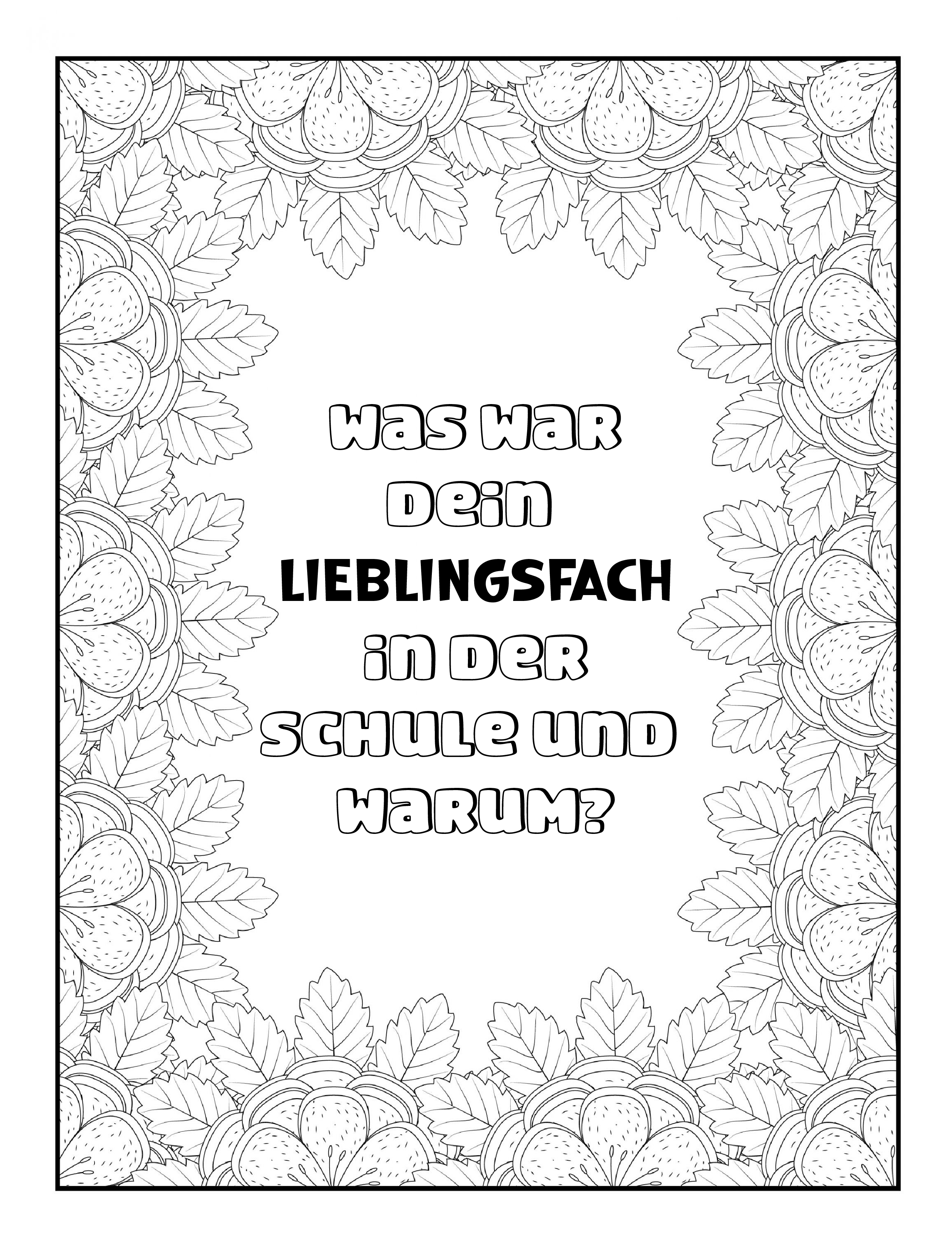 Auf dem Bild sehen Sie eine Vorschauseite aus "Farbenfrohe Erinnerungen", ein Ausmal- und Erinnerungsbuch, das zum kreativen Ausdruck und zum Festhalten kostbarer Kindheitserinnerungen einlädt. Im Zentrum der Seite steht die Frage "Was war dein Lieblingsfach in der Schule und warum?", umgeben von einem kunstvoll mandalaartigen Rahmen aus stilisierten Früchten und Blättern, der zum Ausmalen einlädt. Dies bietet eine wunderbare Gelegenheit, in Erinnerungen zu schwelgen und gleichzeitig entspannende Momente zu genießen. Diese Vorschauseite ist kostenlos verfügbar und wenn sie Sie inspiriert, können Sie das vollständige Buch erwerben, um Ihre eigene Reise fortzusetzen.