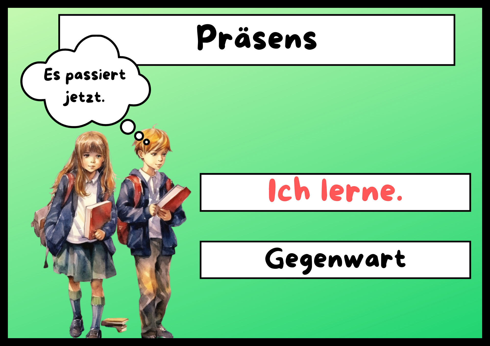 Ich freue mich, eine sorgfältig konzipierte Serie von Plakaten zu präsentieren, die sich jedem der sechs Zeitformen der Deutschen Sprache widmen: Präsens, Präteritum, Perfekt, Plusquamperfekt, Futur I und Futur II. Diese Plakate sind mehr als nur einfache Dekoration – sie sind das Ergebnis eingehender Forschung und Engagement für den Sprachunterricht, gestaltet, um Lernenden aller Altersstufen von Grundschülern bis zu Erwachsenen zu helfen.