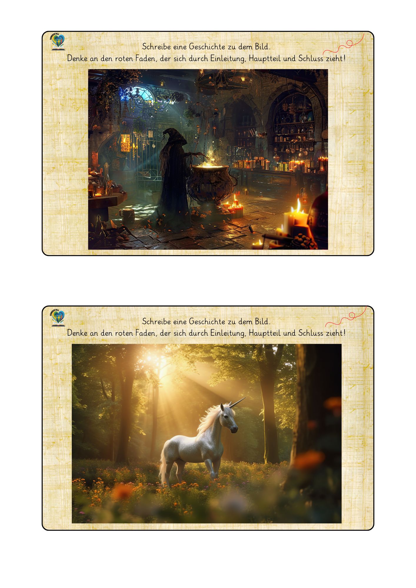 - Klare Aufgabenstellung: Auf jeder Seite findet ihr die Anweisung: „Schreibe eine Geschichte zu dem Bild. Denke an den roten Faden, der sich durch Einleitung, Hauptteil und Schluss zieht!“